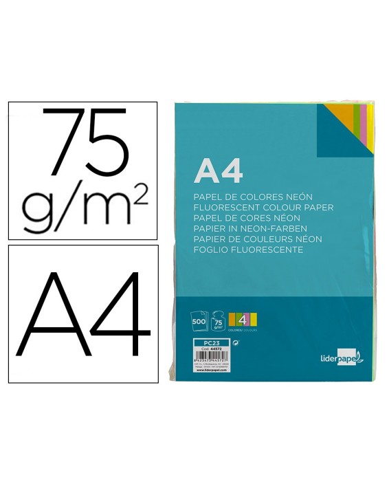 Papel color liderpapel a4 75gr neon 4 colores surtidos paquete de 500 hojas