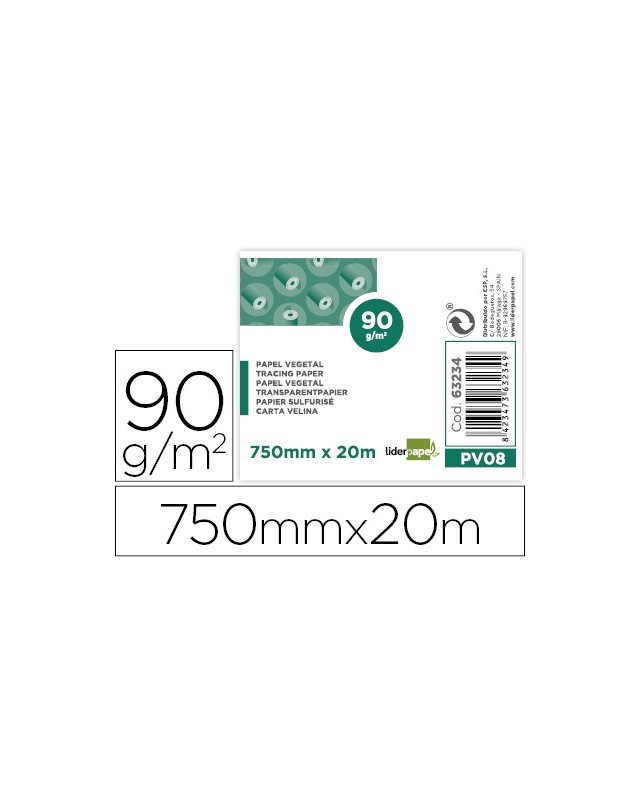 Papel dibujo liderpapel 750mmx20m 90g/m2 vegetal rollo
