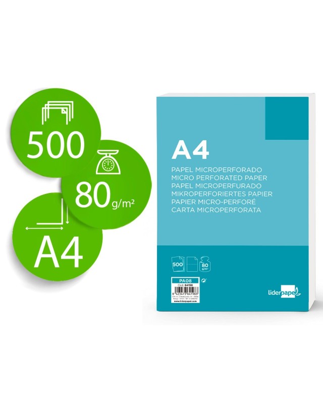 Papel liderpapel a4 80g/m2 liso microperforado en dos partes iguales paquete de 500 hojas fsc