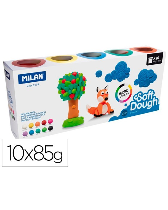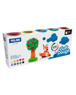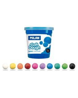 Pasta de modelar blanda \"Soft Dough\". Una pasta consistente y elástica, fácil de modelar. Contiene 10 colores: blanco, amarillo, naranja, rojo, rosa, lila, azul, verde claro, verde y negro. Se pueden crear nuevos tonos combinando dos o más colores. No deja residuos en las manos. Almacenada en botes de 85 g con tapa transparente apilables entre sí. Ingredientes de origen vegetal.