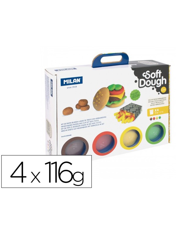 Kit de pasta blanda a base de trigo con herramientas Casa de las hamburguesas. Contenido del maletín: 4 botes de 116 g (de color amarillo, rojo verde y marrón) y 12 piezas (herramientas y moldes). Soft Dough es una pasta consistente y elástica, fácil de modelar y reutilizable. Se pueden crear nuevos tonos combinando dos o más colores. No deja residuos en las manos. Ingredientes de origen vegetal (contiene gluten). Este juguete fomenta la creatividad y el desarrollo de la psicomotricidad fina.