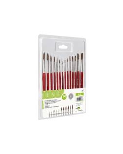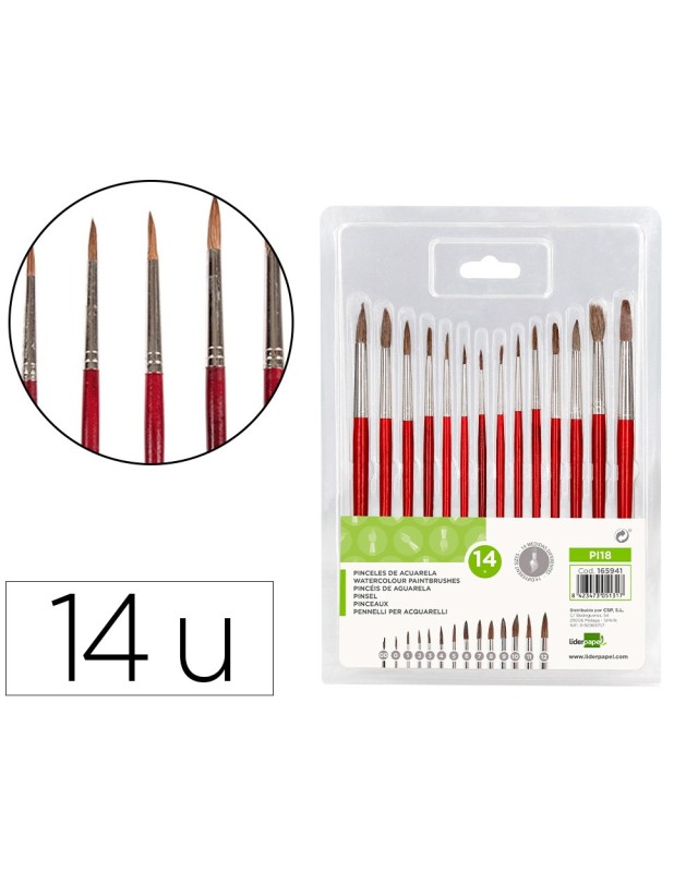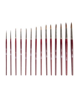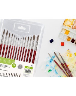 Pinceles de madera con virola cromada. Pelo engomado. Indicados para utilizar con acuarela. Blíster de 14 unidades surtidos. Contiene los números 00-0-1-2-3-4-5-6-7-8-9-10-11 y 12. Una gama completa, más cómoda, facilita todas las posibilidades creativas.
