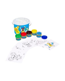 Cubo con asas que contiene todo lo necesario para divertirte jugando con la pintura de dedos Jovi. Una pintura lavable a base de ingredientes naturales, en colores vivos y mezclables entre sí. Sin gluten, libre de los principales alérgenos y no tóxica. Con sus divertidas plantillas de animales aprenderás los diferentes colores pintado con los dedos. Una vez acabes de jugar, podrás volver a guardar todo de nuevo en el bote para otra ocasión.