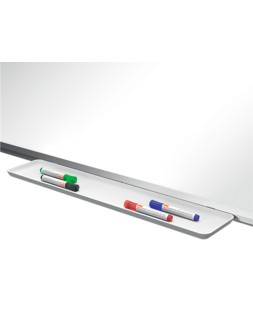 Pizarra magnética de acero lacado de formato panorámico con un moderno y elegante marco de aluminio. Se fija a la pared desde las esquinas y se suministra con una bandeja para guardar cómodamente rotuladores y borradores. La superficie ofrece un mayor nivel de borrado para un uso frecuente.