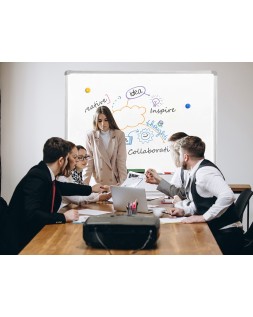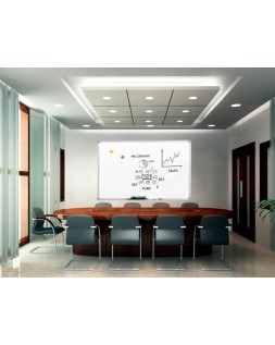Superficie laminada blanca. Marco de aluminio plata mate y cantoneras redondeadas de plástico gris claro. Su acabado permite borrar con mayor facilidad sin que queden marcas. Provista de accesorios de fijación a la pared. Bandeja incluida. Utilizar solo rotuladores para pizarras blancas. Por su tamaño y características es ideal para centros de formación: academias, institutos, universidades, etc. Adaptable a formato vertical.