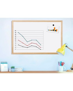 Pizarra de melamina, con una superficie lisa que permite una escritura suave y uniforme. Superficie lavable. Gran estabilidad. Utilizar solo rotuladores especiales para pizarra blanca. Con marco de madera de pino natural. Provista de accesorios de fijación a la pared.
