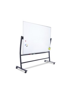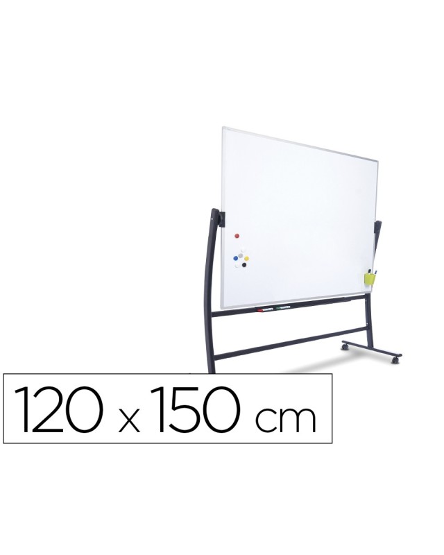 Pizarra móvil volteable de doble cara 120x150 cm. Superficie blanca de acero lacado magnético y marco de aluminio anodizado. Incluye bandeja para rotuladores. Estructura volteable con forma ergonómica curvada de gran diseño. Sistema patentado de rotación que permite el giro y bloqueo de la pizarra sin necesidad de accionar ninguna palanca o pomo, aportando mayor seguridad en el giro y evitando cualquier movimiento de oscilación o vibraciónal escribir. Estructura con ruedas para su desplazamiento. Incluye bandej a para rotuladores.