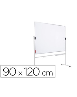 Pizarra móvil volteable de doble cara 90x120 cm. Superficie blanca de acero vitrificado magnético y marco de aluminio anodizado. Estructura volteable construida en acero. Sistema patentado de rotación que permite el giro ybloqueo de la pizarra sin necesidad de accionar ninguna palanca o pomo, a portando mayor seguridad en el giro y evitando cualquier movimiento de oscilación o vibración al escribir. Estructura con ruedas para su desplazamiento. Incluye bandeja para rotuladores.