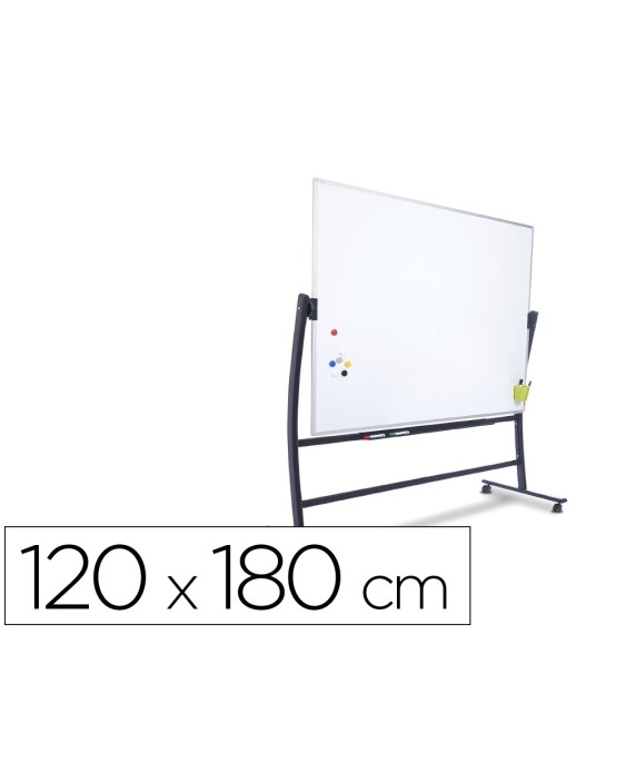 Pizarra móvil volteable de doble cara 120x180 cm. Superficie blanca de acero vitrificado magnético y marco de aluminio anodizado. Incluye bandeja para rotuladores. Estructura volteable con forma ergonómica curvada de grandiseño. Sistema patentado de rotación que permite el giro y bloqueo de la pizarra sin necesidad de accionar ninguna palanca o pomo, aportando mayor seguridad en el giro y evitando cualquier movimiento de oscilación o vibr ación al escribir. Estructura con ruedas para su desplazamiento. Incluye bandeja para rotuladores.