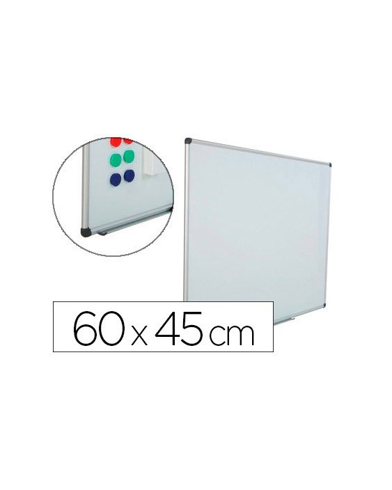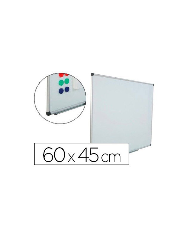 Pizarra blanca rocada acero vitrificado magnetico marco aluminio y cantoneras pvc 60x45 cm incluye bandeja para
