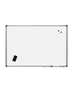 Pizarra blanca magnética con superficie de acero vitrificado. Superficie blanca apta para escritura con rotuladores de borrado en seco. Marco de aluminio y cantoneras embellecedoras de PVC. Trasera galvanizada reforzada. Disponible en una amplia variedad de tamaños. Incluye bandeja para rotulador y tornillos fijadores a la pared.