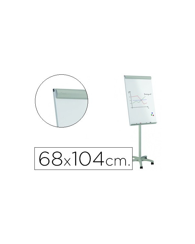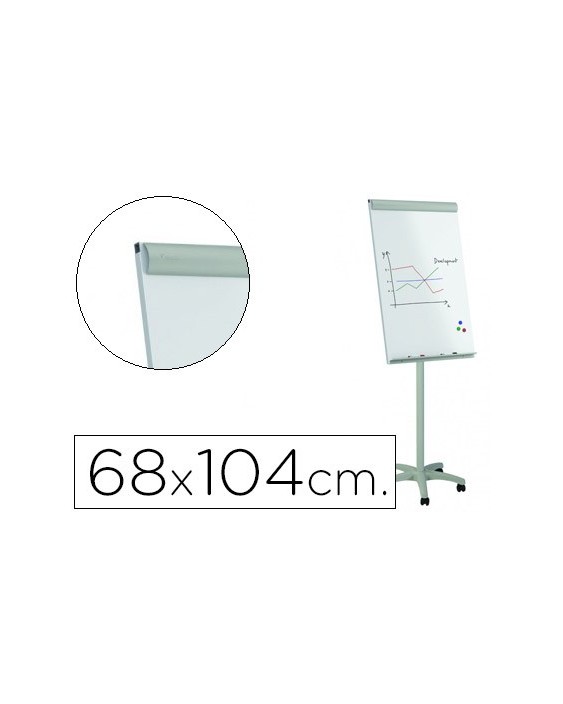 Pizarra de conferencias con base de ruedas. Superficie de escritura metálica y magnética ideal para escribir con rotuladores de borrado en seco o bloc de papel. Admite bloc de papel universal. Incorpora brazo extensible lateral para mostrar una segunda hoja. Embellecedor de diseño en la parte superior para esconder los pomos de sujeción del bloc. Incluye bandeja para rotuladores. No regulable en altura. Fácil montaje. Medidas del tablero: 68 x 104 cm.