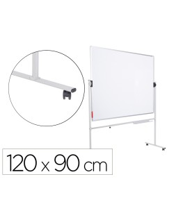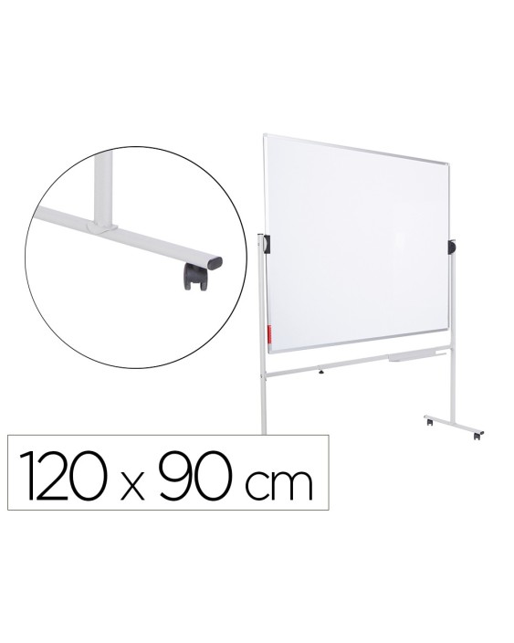Pizarra móvil volteable de doble cara 90x120 cm. Superficie blanca de acero lacado magnético y marco de aluminio anodizado. Incluye bandeja para rotuladores. Estructura volteable. Sistema patentado de rotación que permite el giro y bloqueo de la pizarra sin necesidad de accionar ninguna palanca o pomo, aportando mayor seguridad en el giro y evitando cualquier movimiento de oscilación o vibración al escribir. Estructura con ruedas para su desplazamiento. Incluye bandeja para rotuladores.