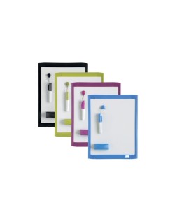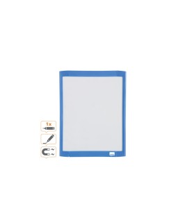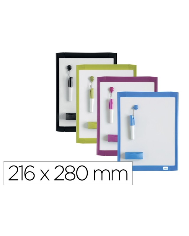 Esta mini pizarra magnética viene en una variedad de colores de marco, conun rotulador y un borrador de pizarra a juego. Con un elegante marco en u na variedad de colores, rosa, azul, negro o verde. Cualquiera que sea el color que recibas, puedes estar seguro de que se adaptará a cualquier entorno. Estas divertidas y coloridas pizarras son perfectas para el montaje enla pared o para usar como pizarra portátil, y se completan con almohadill as adhesivas de montaje en pared e imanes para usar en superficies magnéticas como la nevera. Móntalas en orientación vertical u horizontal. Tamaño: 216x280 mm.
