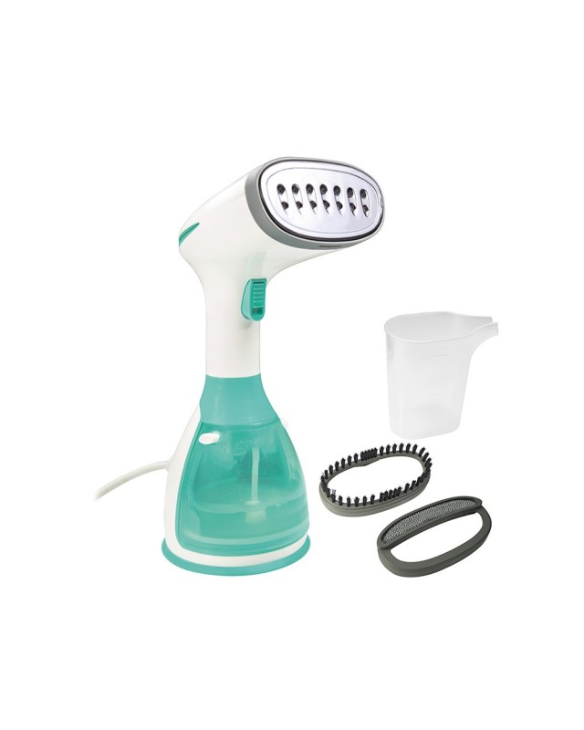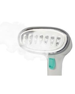 Plancha a vapor vertical. Sistema antigoteo. Perfecta para planchar prendas directamente en la percha. Botón de vapor continuo (25 gr/min). Indicador luminoso de encendido. Accesorios extraíbles: cepillo para ropa delicada y quita pelusas. Calentamiento rápido en 45 segundos. 1500 w. Depósito de 280 ml. Medidas: 170 x 290 x 120 mm.
