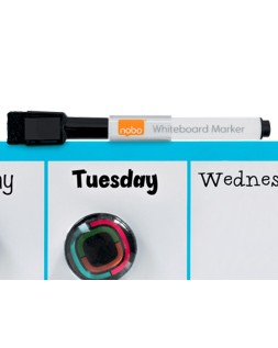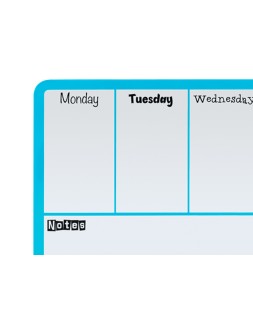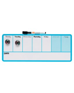 Miniplanificador semanal de pizarra magnética. Con una parte de pizarra de borrado en seco para tomar notas para cada día de la semana más una sección de notas adicionales. Incluye clip portarrotulador integrado, 2 almohadillas de montaje adhesivas para pizarra blanca y 2 imanes. Medidas: 36 x 14 cm.