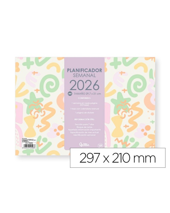 Este año, manten todo bajo control con el planning semanal de Pared 2026 de Liderpapel. Especialmente diseñado para quienes quieren darle un toque fresco y moderno a su espacio, sin perder la funcionalidad. Este planning semanal es la herramienta perfecta para organizar tus semanas de manera eficiente y con estilo. Su formato de lomo engomado asegura durabilidad y facilidad de uso. Además, su tamaño compacto lo hace ideal para cualquier espacio. Fabricado con materiales de alta calidad. No dejes que ningún eventoo cita te sorprenda. Saca el máximo provecho del 2026 con el planning sem anal de Pared de Liderpapel. Características: planning semanal, Liderpapel, joven, 2026, papel 104 g/m² 297x210 mm, lomo engomado, con pegatinas.