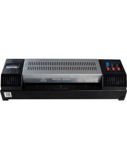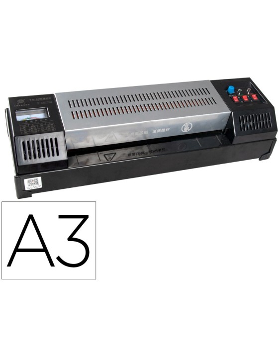 Plastificadora de uso profesional. 4 rodillos. Marcha hacia delante y hacia atrás. Interruptor de encendido y motor independientes. Funcionamiento en caliente, con regulador de temperatura de 75 a 200 ºC. Espesor máximo <= 1 mm. Adecuada para plastificar papel DIN A4 y DIN A3. Utiliza fundas desde 100 hasta 200 micras. Tiempo de calentamiento 2-3 minutos. Medidas: 535 x 195 x 115 mm.