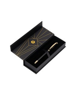 La pluma Soirée es una pieza en color negro con elegantes detalles en dorado. Presentado en una elegante caja de cierre magnético, decorada con un diseño Art Deco en dorado. Tanto el diseño de la pieza como el de la caja, hacen un guiño a los años 20 evocando la elegancia clásica del refinado estilo del Art Deco. La colección Soirée te invita a una velada especial, a través de cada pieza, meticulosamente diseñadas para capturar el encanto y el glamour de la época, combinando elementos modernos con un toque clásico y especial. Tinta color azul. Grosor tamaño M.