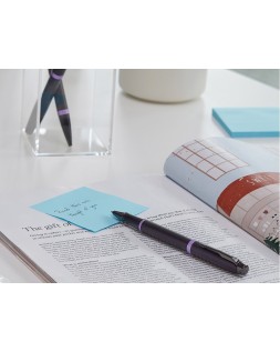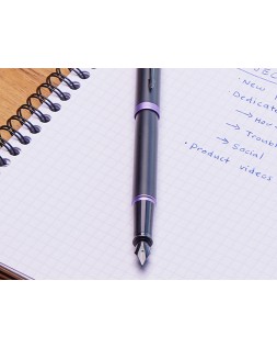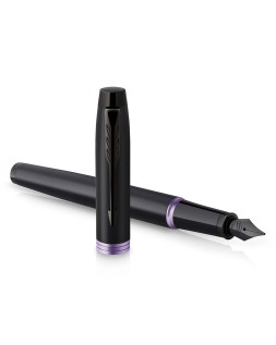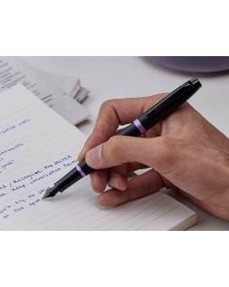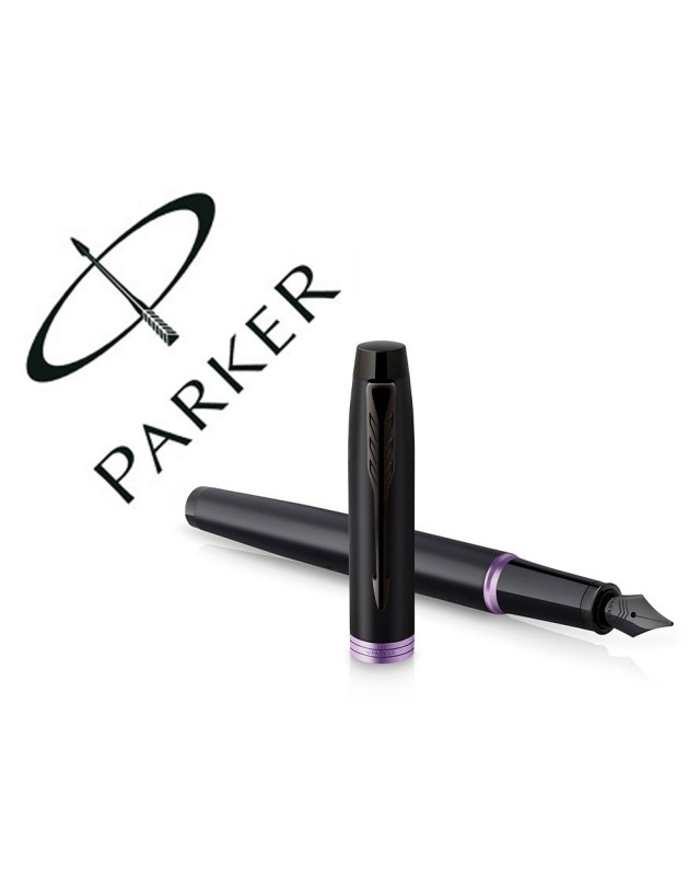 Pluma estilográfica Parker con acabado en laca negra satinada sobre acero inoxidable y llamativos detalles en morado brillante. Diseñada pensando enel profesional moderno, la pluma estilográfica Vibrant Rings de Parker IM es funcional, refinada, y destacará sin duda en cualquier lugar. Al combi nar acabados minimalistas y elegantes completamente negros con detalles llamativos y vibrantes, esta pluma estilográfica de lujo sabe cómo causar una excelente primera impresión con un estilo discreto. Con más de un siglo de experiencia y artesanía propia, Parker proporciona a esta colección unas piezas metalizadas exclusivas adornadas con un revestimiento de PVD, queofrece una resistencia superior al desgaste y la corrosión, así como un l n look distintivo. Plumín fino de acero inoxid