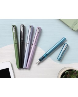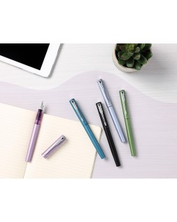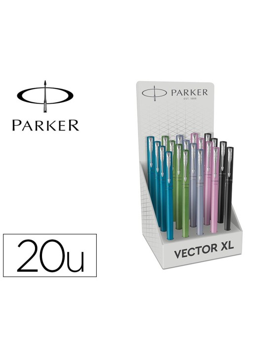 Expositor de sobremesa 20 Plumas Vector XL surtidas. La nueva colección Vector XL es perfecta para las nuevas generaciones y supone un giro de 360 grados respecto al tradicional Vector. Su cuerpo y capuchón son metálicos. Su ancho es mayor que el de Vector, otorgándole una silueta de mayor presencia a la vez que equilibrada, y una escritura confortable. Presenta el logo de Parker grabado en el capuchón y el clip en forma de flecha de Parker. Está disponible en nuevos atractivos colores de tendencia, como el Negro, el Verde, el Azul Teal, el Lila y el Azul Plateado, con un bonito efectomate. Su exclusivo plumín de acero inoxidable es de tamaño generoso, ofre ciendo al mismo tiempo un diseño ligero y algo estilizado, con el logo de de Parker y un motivo grabados. Las plumas Vector