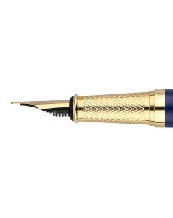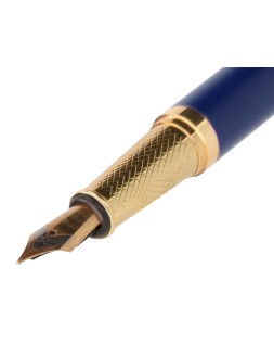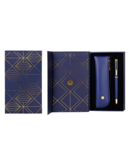 La pluma Soirée es una pieza en color negro con elegantes detalles en dorado, acompañada de un estuche de símilpiel del mismo color, adornado con un refinado detalle metálico dorado. Todo esto está contenido en una elegante caja de cierre magnético, decorada con un diseño Art Deco en dorado. Tanto el diseño de la pieza como el de la caja, hacen un guiño a los años 20 evocando la elegancia clásica del refinado estilo del Art Deco. La colección Soirée te invita a una velada especial, a través de cada pieza, meticulosamente diseñadas para capturar el encanto y el glamour de la época, combinando elementos modernos con un toque clásico y especial. Tinta color azul. Grosor tamaño M.