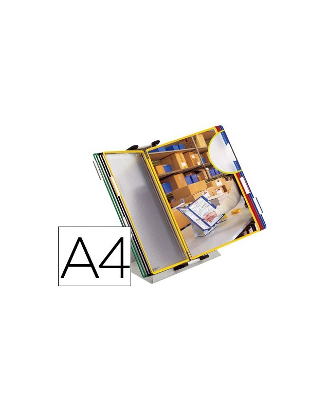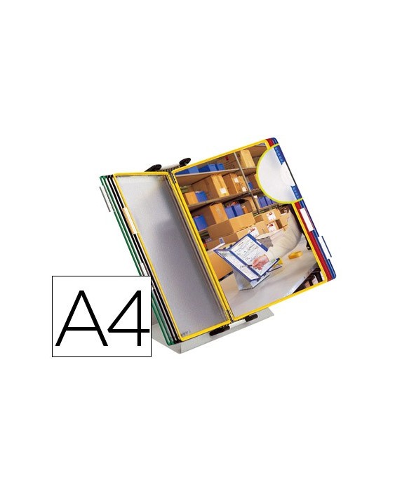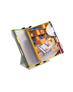 Clasificador de mesa en metal, ampliable, polivalente y muy resistente. Soporte con 10 fundas DIN A4, fabricadas en PVC en colores surtidos. Incluye 5 índices neutro /color. Se puede fijar a la pared. Extensión hasta 30 fundas si se añade el soporte del clasificador mural (cód. 76162).