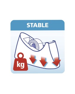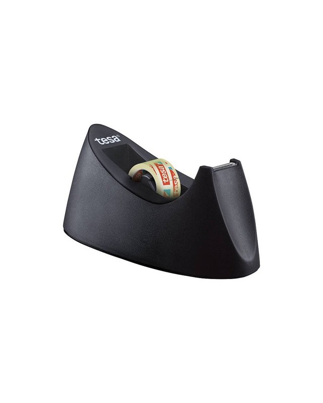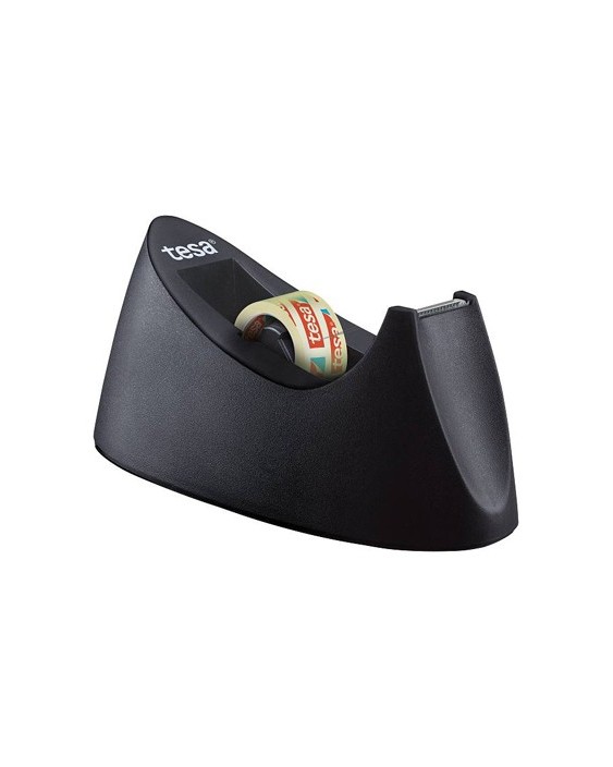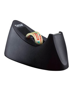 Portarrollos de sobremesa de plástico. Antideslizante y estable, su peso garantiza una colocación segura. Corte limpio gracias a la afilada cuchilla dentada. Con alfombrilla protectora bajo el dispensador que evita arañar el escritorio u otros muebles. Incluye cinta adhesiva. Color negro. Para cintas de 33 m x 19 mm. Medidas: 194 x 90 x 75 mm.