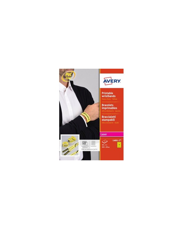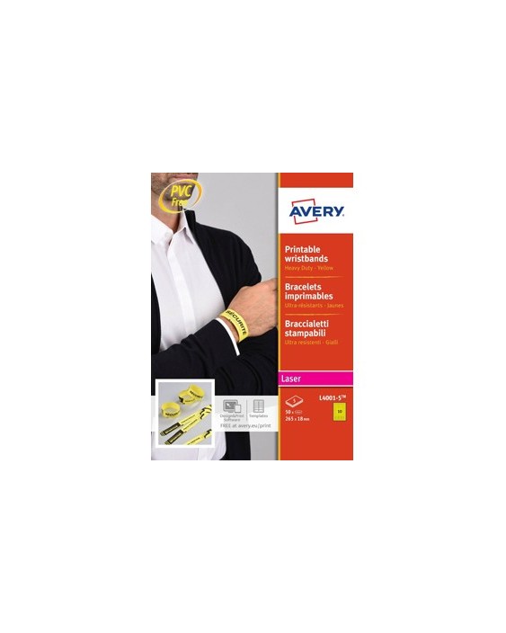 Pulseras identificativas imprimibles en polipropileno de 120 micras. 160 g/m². Resisten al sudor y a los desgarros. Suaves, flexibles y adaptables atodas las medidas de muñecas. Ideales para eventos, parques acuáTicos, co nciertos, hoteles. Imprimibles con láser blanco/negro y de color. Medidas: 265x18 mm. Se puede utilizar el software crea e imprime gratuito de Averypara realizar el diseño de las etiquetas con pocos clics.