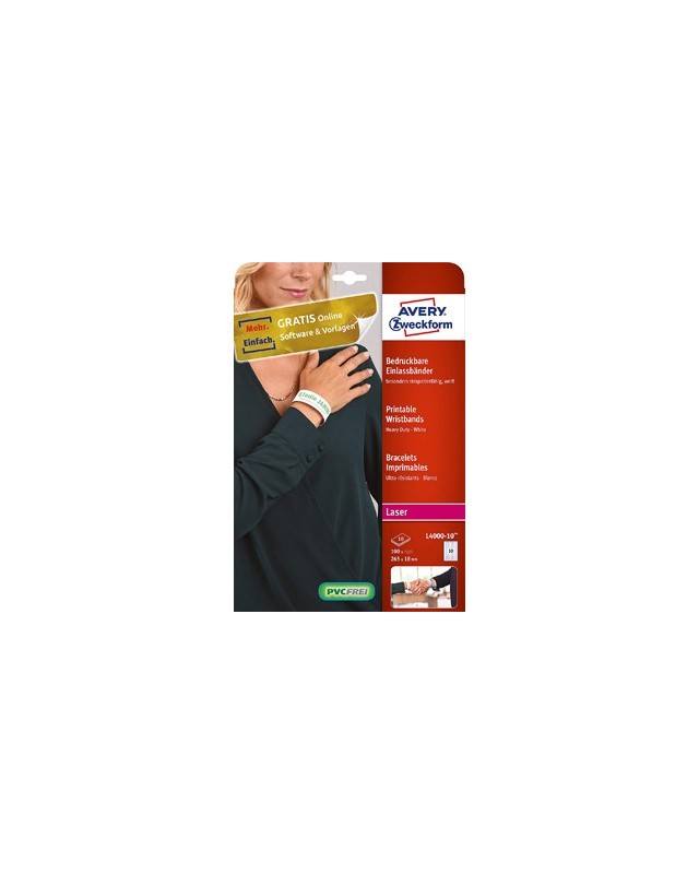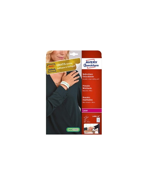 Pulseras identificativas imprimibles en polipropileno de 120 micras. 160 g/m². Resisten al sudor y a los desgarros. Suaves, flexibles y adaptables atodas las medidas de muñecas. Ideales para eventos, parques acuáTicos, co nciertos, hoteles. Imprimibles con láser blanco/negro y de color. Medidas: 265x18 mm. Se puede utilizar el software crea e imprime gratuito de Averypara realizar el diseño de las etiquetas con pocos clics.