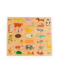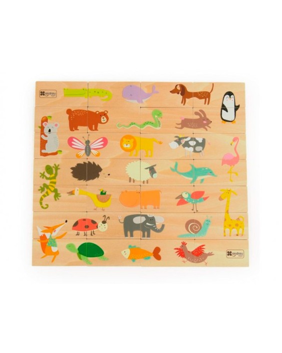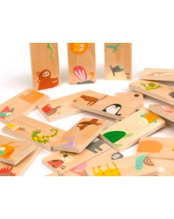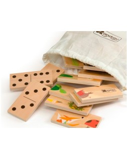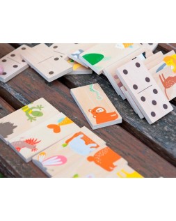 Puzzle dominó de 28 piezas. Empareja las mitades de los animales, en horizontal y vertical, para formar un bonito puzzle. Juega al clásico dominó depuntos dando la vuelta a las piezas de madera. Incluye saco de tela. Medi das de la pieza: 8x4x0,7 cm.