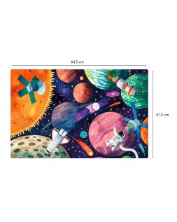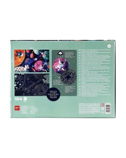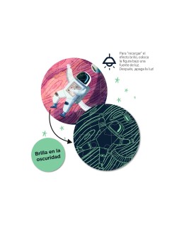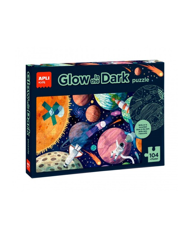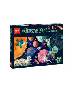 Puzle fluorescente Glow in the dark con temática del Sistema Solar. Incluye 104 piezas tamaño 5 x 5 cm. Tamaño del puzle: 64,5 x 41,5 cm. Contiene un póster a tamaño real para facilitar el montaje. Una vez el puzle esté montado, los niños podrán apagar la luz para ver brillar los distintos planetas, estrellas y satélites del Sistema Solar. Importante: para \"recargar\" el efecto fluorescente, coloca el puzle bajo una fuente de luz durante al menos media hora. Después, ¡apaga la luz para que se haga la magia! Fácil manejo para los más pequeños, piezas resistentes, seguras y fáciles de man