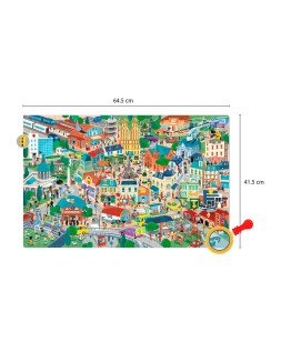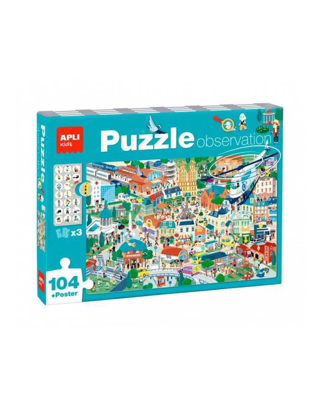 Puzle de observación con temática Ciudad. Incluye 104 piezas de tamaño 5 x5 cm. Tamaño del puzle: 64,5 x 41,5 cm. Contiene un póster de tamaño real para facilitar el montaje y 3 fichas con diferentes objetos. Una vez el p uzle esté montado, los niños deberán encontrar los objetos de las fichas dentro de la imagen del puzle. En este caso, deberán buscar elementos como semáforos, turistas, bicicletas o coches entre las inmensidades de la ciudad. Fácil manejo para los más pequeños: piezas resistentes, seguras y fáciles de manejar. Cartón de 2 mm de grosor. Los puzles ayudan a mejorar y desarrollar multitud de capacidades y habilidades, mejoran la concentración,la observación, la memoria y la resolución de problemas, y desarrollan la la percepción espacial, la psicomotrici