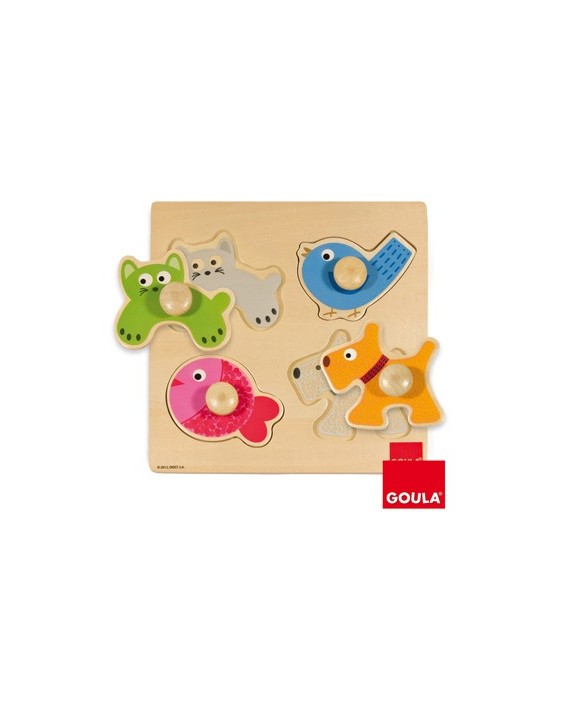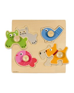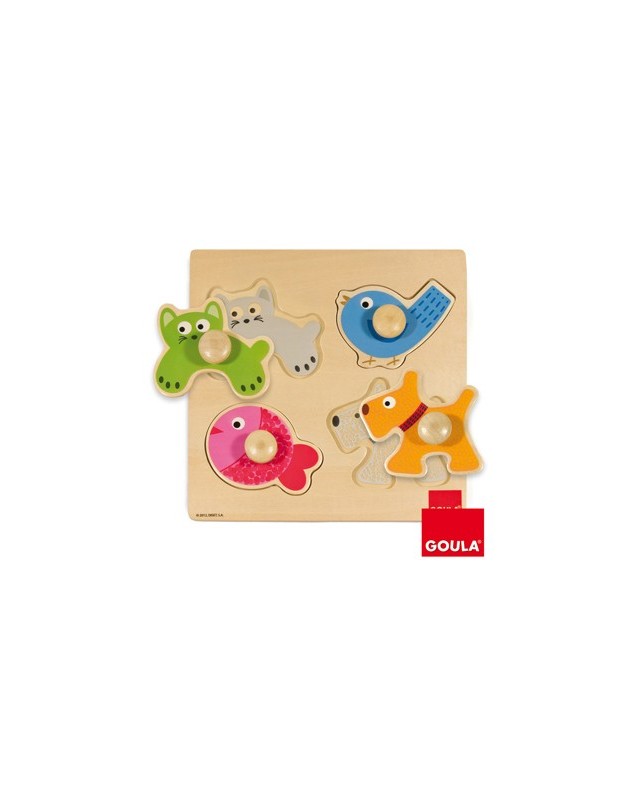Primer puzle de cuatro piezas de madera para los más pequeños. Aprende cuatro animalitos domésticos, como son el gato, el perro, un pajarito y un pez. Asocia la pieza con su silueta. Desarrolla la coordinación ojo/mano. Destreza manual. Aprendizaje de diferentes colores. A partir de 1 año. Medidas: 22 x 22 x 4 cm.