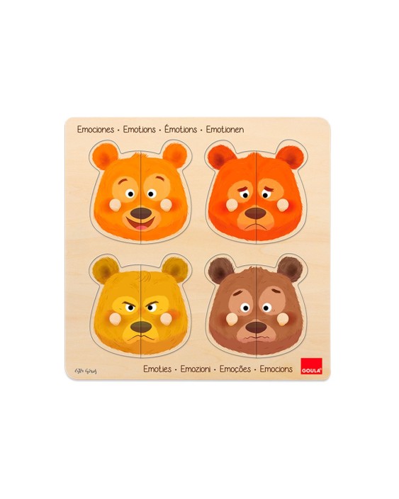Puzle de 8 piezas de madera ilustrado con 4 caras de osos distintas para expresar 4 emociones distintas: miedo, felicidad, enfado y tristeza. Los niños pueden encajar las distintas figuras guiándose por su silueta o por eldibujito que aparece en el interior, este tiene ilustrada una imagen repr esentando cada emoción para hacer más sencillo el emparejamiento. Cada unade las piezas tiene pivotes pequeños para que al niño le sea un poco más difícil el agarre.