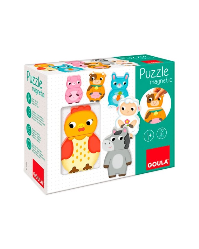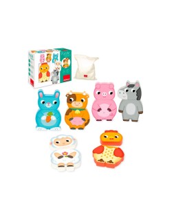 Puzle para relacionar las dos partes del animal pero también se puede mezclar los animales y crear personajes nuevos y divertidos. Cambiando la cabeza y el cuerpo los niños y niñas encontraran diferentes combinaciones de animales de la granja. El producto contiene una bolsa de tela blanca para poder guardar las piezas.