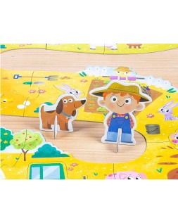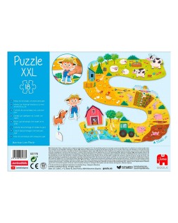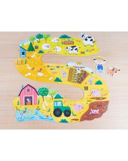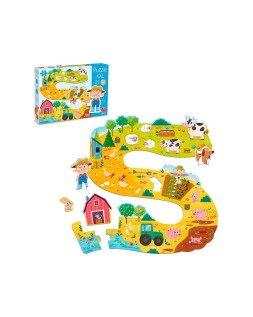 Puzle de cartón con 17 piezas gigantes ambientadas en la granja y dos figuras para poder jugar una vez se haya construido. El puzle conforma una camino serpenteado con distintos elementos que pueden encontrarse en una granja: un huerto, campo con pollitos, con cerditos, vacas y ovejas, un pequeño estanco con patos una granja y un tractor.