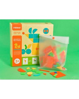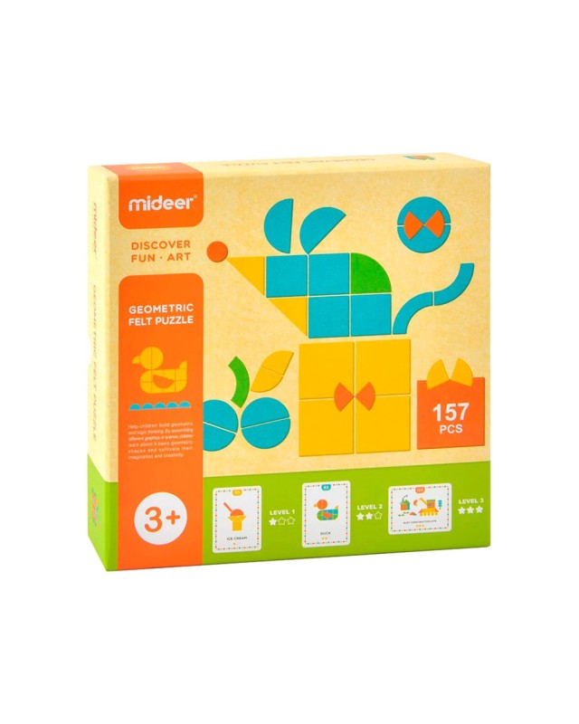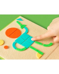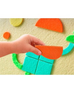 Crea figuras geométricas con fieltro en el tablero de doble cara o reproduce los dibujos de las plantillas, con 3 niveles de dificultad, para desarrollar el razonamiento lógico y la imaginación. Contiene 120 ejemplos, tablero y 157 piezas geométricas de fieltro.