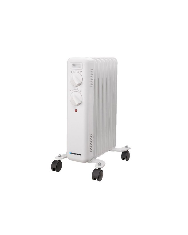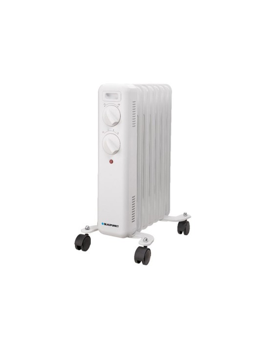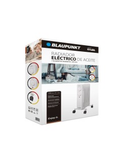 Radiador eléctrico de aceite Blaupunkt BP1016. 1500W. 7 elementos radiantes, compacto y eficiente, ideal para calentar espacios pequeños con seguridad. Termostato regulable, protección contra sobrecalentamiento, ruedas multidireccionales, asa para transporte, diseño compacto. Color blanco.