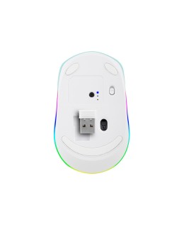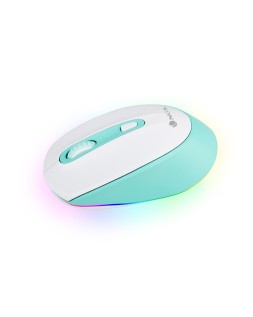 Ratón inalámbrico recargable con tecnología Bluetooth para varios dispositivos. 2,4 GHz + BT3.0 + BT5.0, compatible con 3 dispositivos a la vez. Canal para USB de 2,4 GHz con una conexión potente y fiable. Equipado con una batería de litio recargable, fácil de cargar con el cable USB de tipo C incluido. Incluye una rueda de desplazamiento de goma antideslizante con un diseño óptimo de deslizamiento y 3 botones. Clic silencioso. Dispone de retroiluminación RGB personalizable con 15 colores. Ambidiestro. Alcance inalámbrico de 8-10 m. Hasta 50 horas de batería en una sola carga. Botón de encendido/apagado de ahorro de energía.