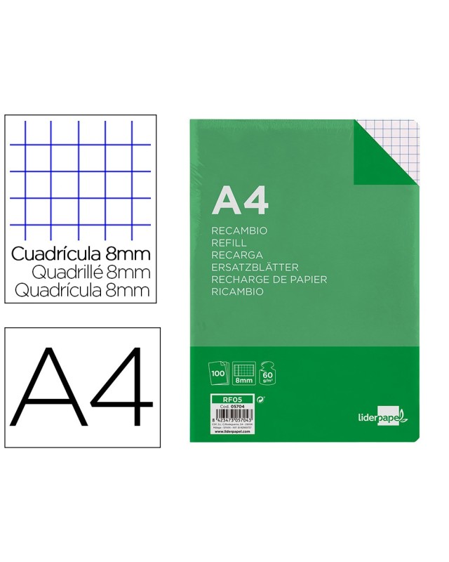 Recambio liderpapel a4 100 hojas 60g/m2 cuadro 8mm con margen 4 taladros