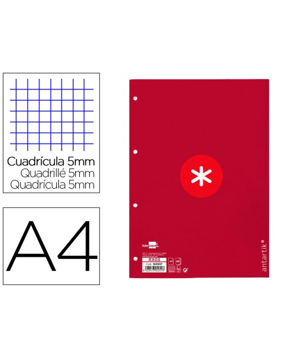 Recambio DIN A4 Antartik 80 hojas. Cuadro de 5 mm. 1 banda con 4 taladros. El recambio con exclusivo diseño, características de alta gama, un recambio sin precedentes que se distingue por la suavidad y blancura de su papel. Papel extrablanco de 90 g/m² ultrasuave que hace la escritura mucho más fluida. La tinta no traspasa.