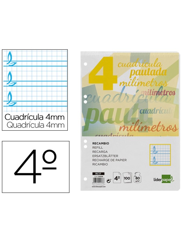 Recambio liderpapel cuarto pautaguia 100 hojas 75 g cuadriculado pautado 4mm con margen 6 taladros