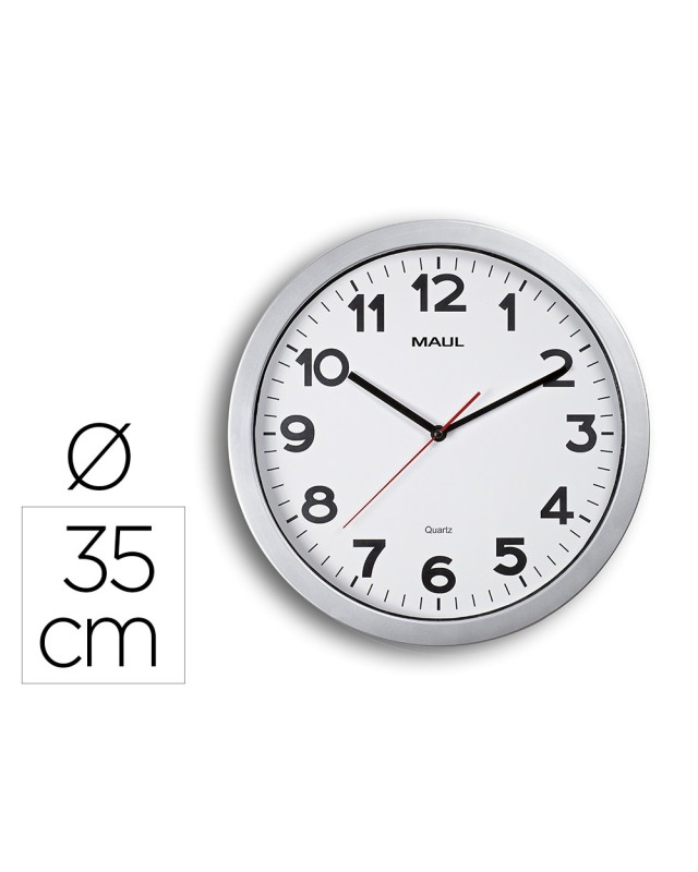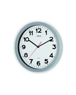 Modelo estándar grande con diseño elegante. Moderno marco de plástico irrompible. Tipo de letra especialmente legible. Aspecto discreto para oficinas o el hogar. Cubierta plana de cristal mineral. De quarzo. Funcionamientocon pilas, incluida una pila de 1,5 V (AA). Números arábigos en negro, le tra fina. Altura de los dígitos 3 cm. Esfera blanca con unidades de minutos y horas. Eje en color puntero. Fijación mural mediante ojal de pera.