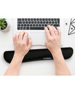 Reposamuñecas Memory Foam para teclado. Proporciona el apoyo adecuado parala muñeca, ayudando a reducir la tensión en la misma. Fabricado en espuma de alta densidad. Base antideslizante. Superficie que mejora la tracción del ratón. 460 x 85 x 25mm. Color Negro.