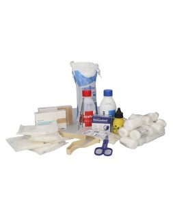 Reposición material primeros auxilios para botiquín cód. 76252. Contenido:5 paquetes de gasas. 15 rollos de vendas de 5 metros de longitud (5 de 10 cm de ancho, 5 de 7 cm y 5 de 5 cm). 1 goma para extracciones. 1 paquete de algodón. 1 tijera recta aguda roma de 11 cm. 1 par de guantes de látex.1 pinza de disección de 11 cm. 1 rollo de esparadrapo. 2 cajas de tiritas . 1 suero fisiológico de 5 ml. 1 bote de alcohol de 250 cc. 1 bote de agua oxigenada de 250 cc. 1 bote de povidona yodada de 40 cc.