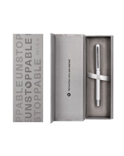 El roller Unstoppable es un símbolo de determinación. Su cuerpo de color gris se presenta en una imponente caja de diseño deportivo, con cierre magnético y una frase inspiradora en la solapa interior que dice remember why you started (recuerda por qué empezaste). Cada trazo de tinta con este roller representa un paso hacia adelante en el camino hacia el éxito, reflejando la pasión y el espíritu de aquellos que se atreven a perseguir lo imposible. Diseñada para personas ambiciosas y motivadas, esta colección es un recordatorio constante de que son capaces de superar cualquier desafío y seguir adelante. El diseño elegante y seguro de la colección Unstoppable transmite un mensaje de empoderamiento y motivación. Es una línea de escritritura inspiradora y poderosa que captura la
