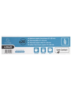 Rollo de sumadora Térmico Safe Contact. 57 mm ancho y diametro 30 mm (9 metros). Para TPV (Tarjetas de Pago Visa). Las bobinas Safe contact están fabricadas con un papel ligeramente azul grisáceo que no teme el calor, la luz o la humedad, lo que garantiza una impresión duradera (mínimo 35 años). Fabricadas sin revelados químico, sin BPA y sin Fenol, las bobinas Safe Contact son seguras para la salud e incluso están aprobadas para el contacto con alimentos. Este papel eco-responsable es reciclable con residuos depapel- Vida muy larga, certificado FSC con impresión en la parte posterio r.
