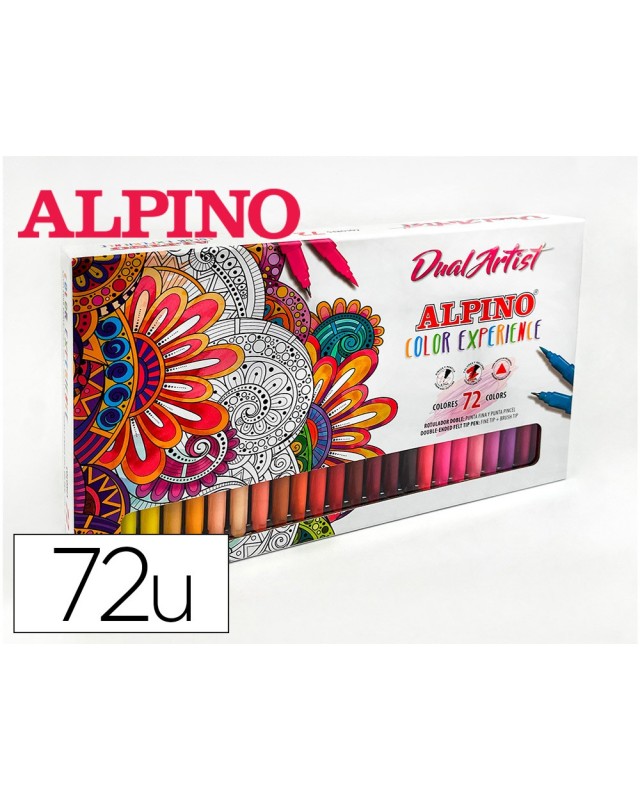 Caja de 72 rotuladores Alpino Color Experience de doble punta. Forma triangular, ergonómico y de cómodo agarre. Doble punta en el mismo marcador, permite dibujos más completos con un mismo rotulador. Punta fine liner de 0,7 mm, perfecta para dibujar y perfilar. Punta pincel de 2,9 mm, ideal paralettering y colorear dibujos.