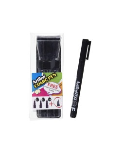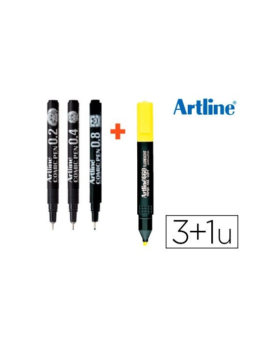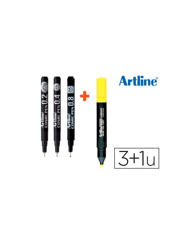 Rotulador artline comic pen calibrado micrometrico negro bolsa de 3 uds 0,2 0,4 0,8 + fluorescente 660